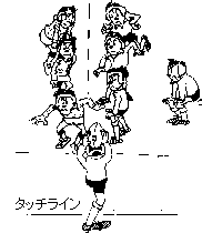またタッチに出たボールが誰にも触れられずに、投げ込む側の スロワーが直接ボールを持ち運んで投げ込む場合に限り、これを 受け取るプレヤーが双方2名以上ずつ集まって(これをラインア ウト