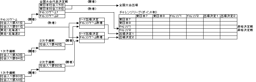 *代表決定戦で東日本が負けた場合は、対戦チームと同資格でチャレンジリーグに参加する